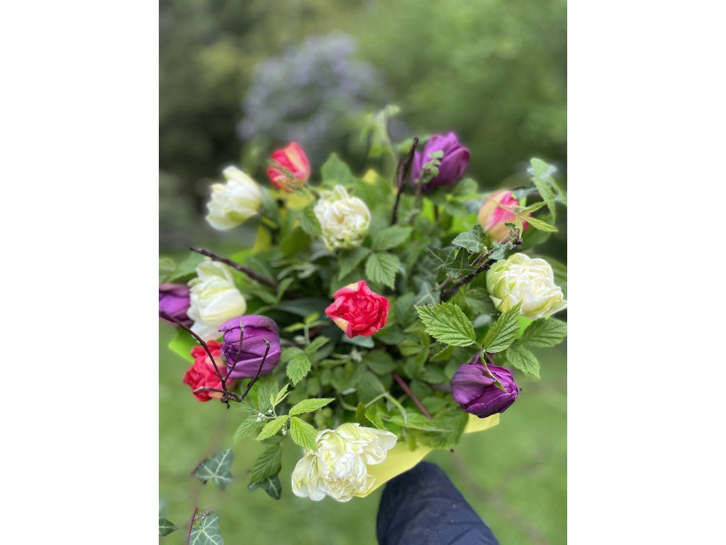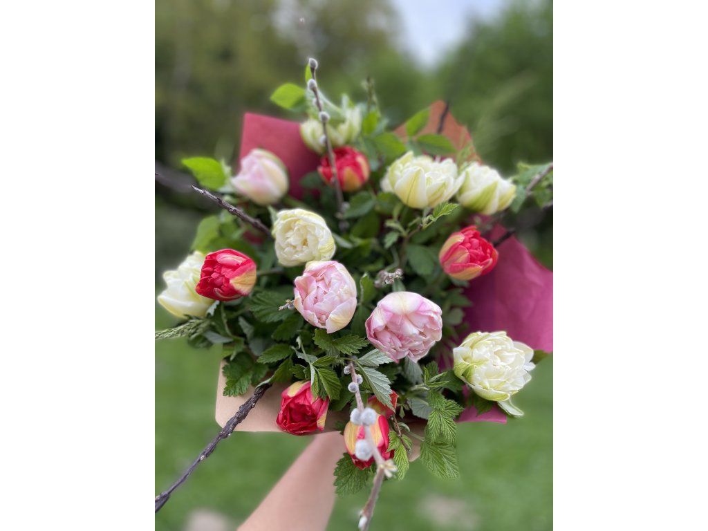 Barevná jarní kytice plnokvětých tulipánů doplněná o rozkvetlé i zelené větvičky a zeleň.
