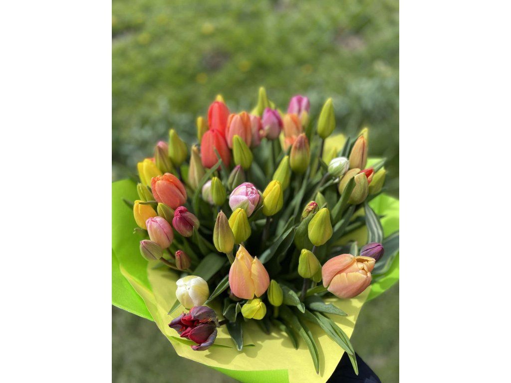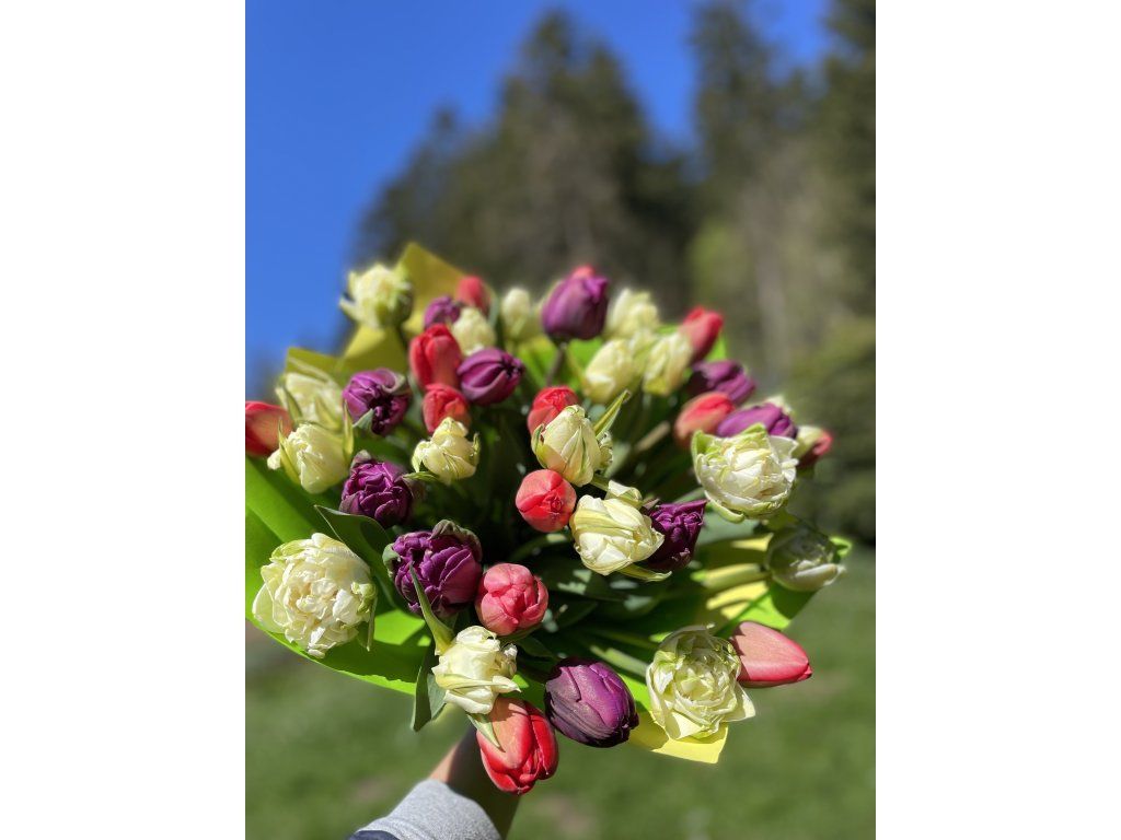Tulipánová kytice obsahuje 40 - 50 kusů prvotřídních plnokvětých i jednoduchých tulipánů vypěstovaných v Aši.